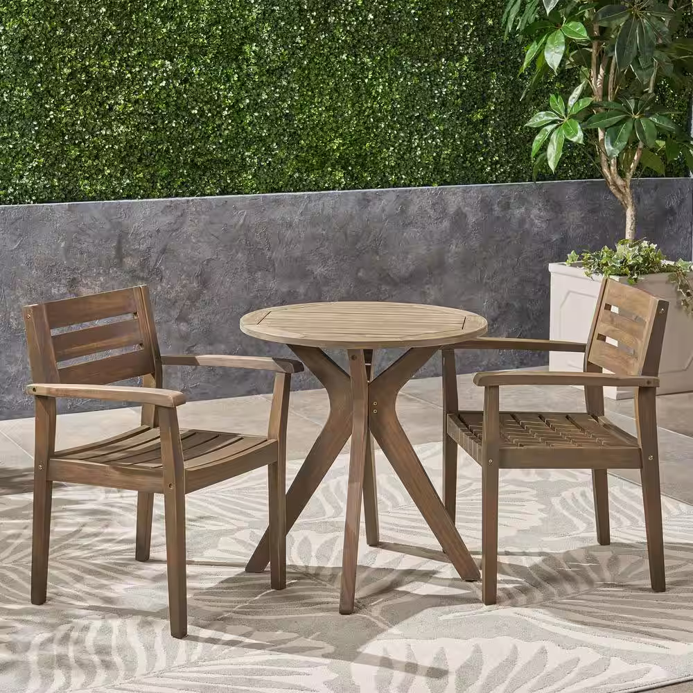 Noble House Stamford Grey 3-Piece Wood Outdoor Bistro Set with Cross-Legged Table