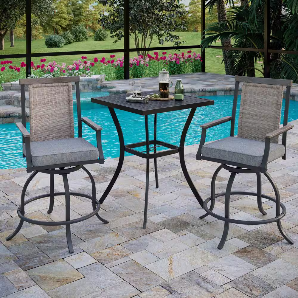 None 3-Piece Metal Square Outdoor Bistro Patio Bar Set with Slat Bar Table and Rattan Bistro Chairs with Gray Cushion