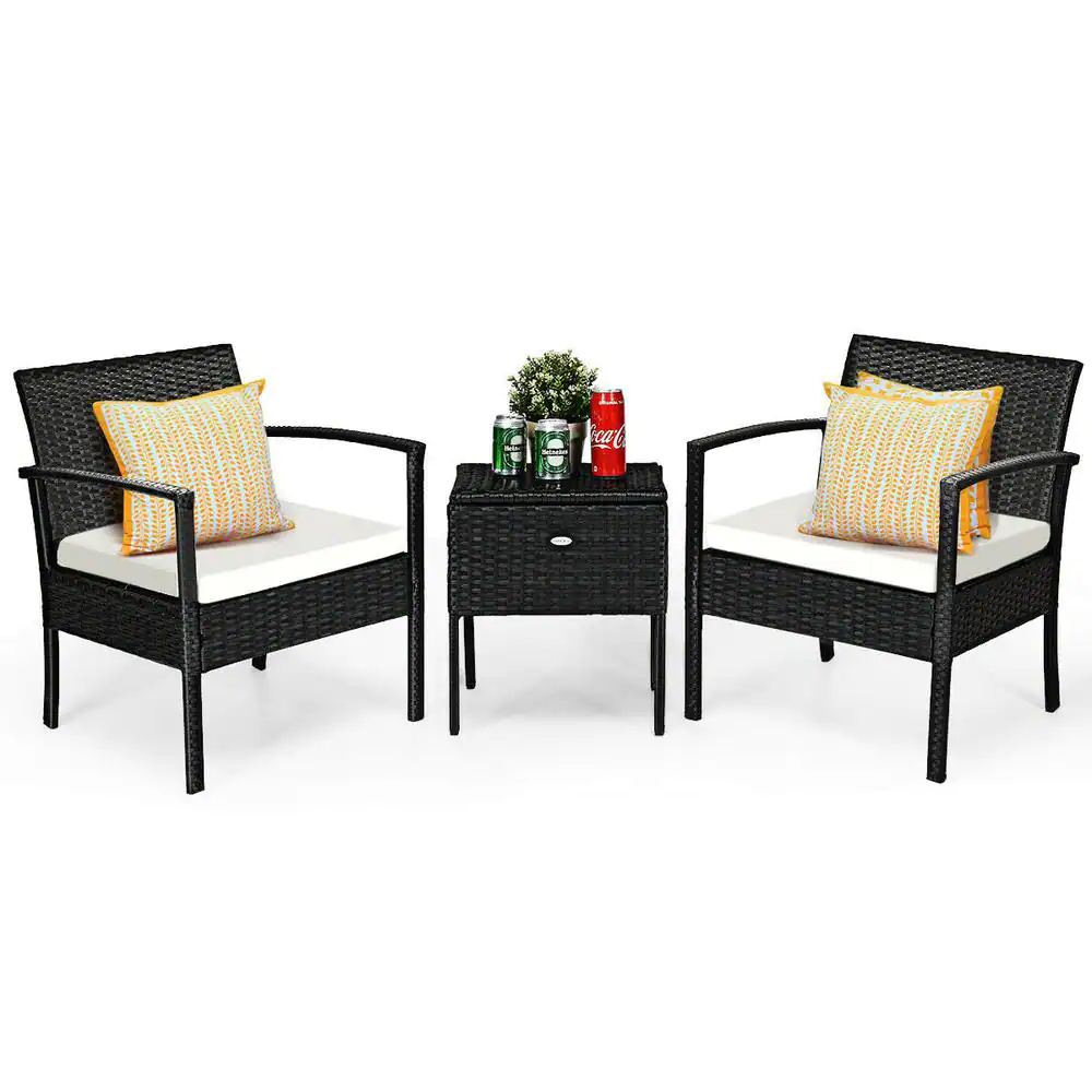 Costway 3-Piece Wicker Outdoor Patio Rattan Bistro Furniture Set with White Cushion and Storage Table