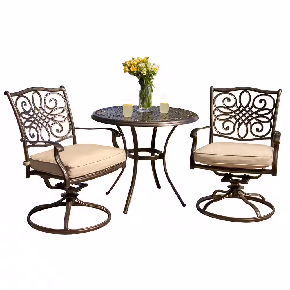 Hanover Traditions 3-Piece Patio Bistro Set with 2-Cast Aluminum Swivel Rockers with Beige Cushions and 32 in. Round Table
