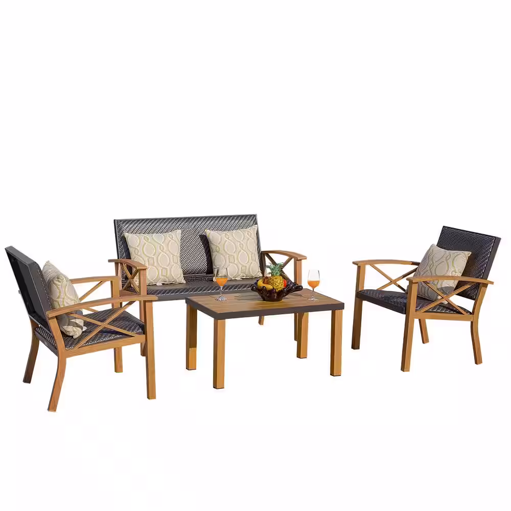 None Wood-Look 4-Piece Aluminum Outdoor Bistro Conversation Set with Brown Cushioned Wicker and Sunbrella Beige Pillows