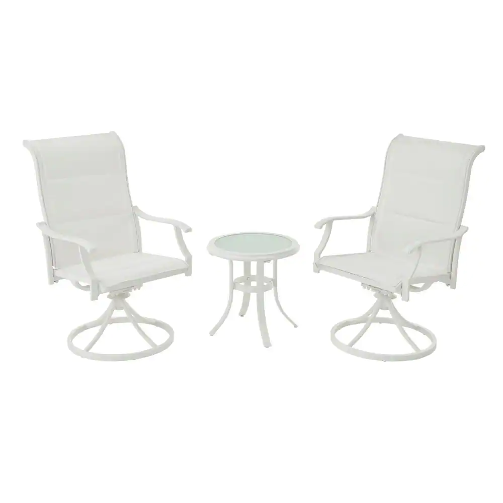 Hampton Bay Riverbrook Shell White 3-Piece Outdoor Patio Aluminum Round Padded Sling Swivel Seating Set