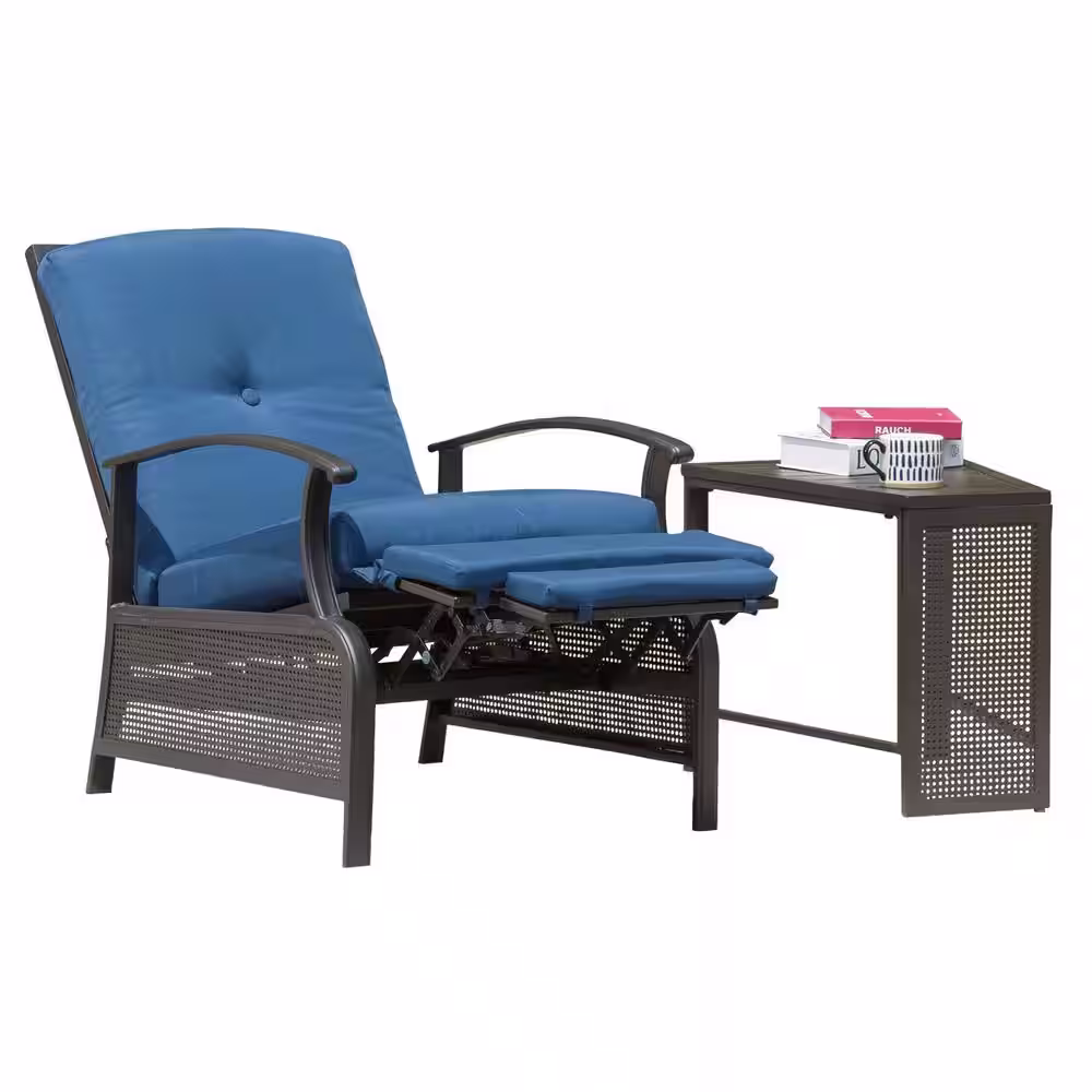 None Brown 2-Piece Metal Outdoor Bistro Recliner Set with Navy Blue Cushions