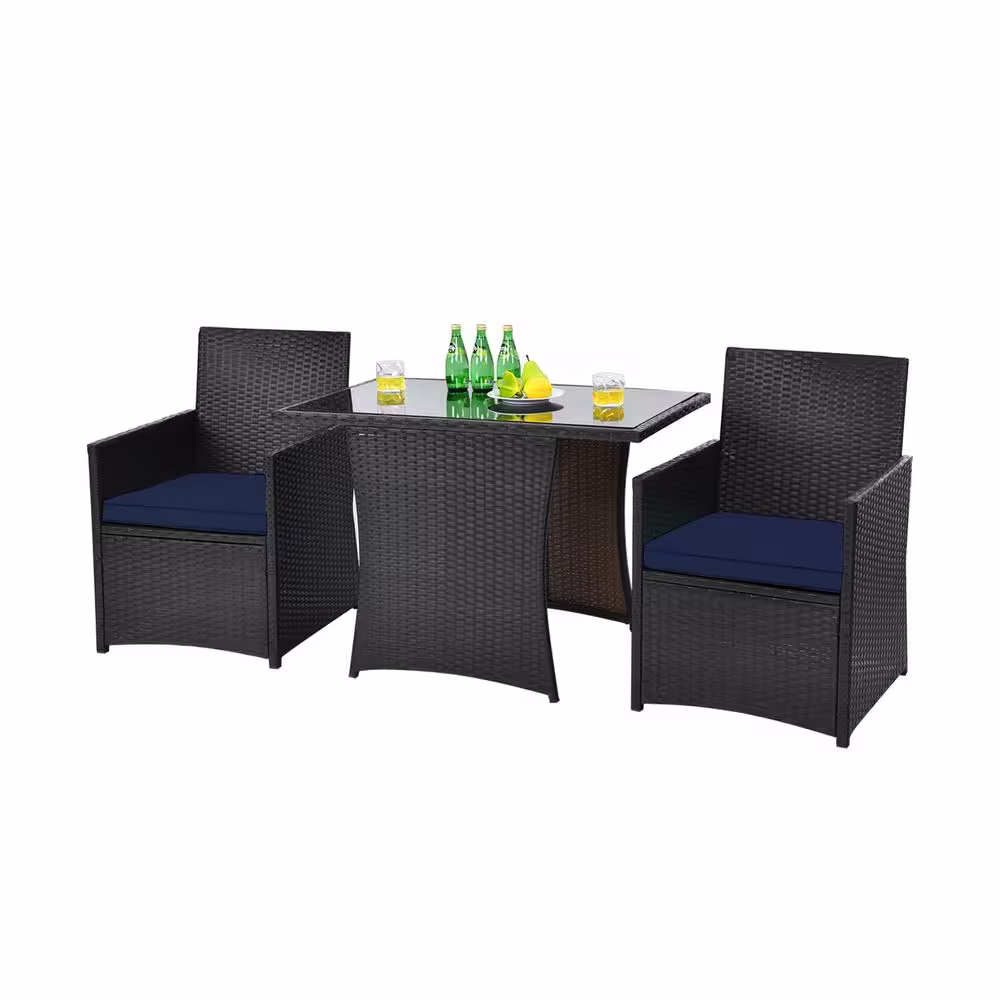 Gymax 3-Piece Wicker Outdoor Dining Patio Bistro Set PE Rattan Dining Table Set with Navy Cushions (3-Pack)
