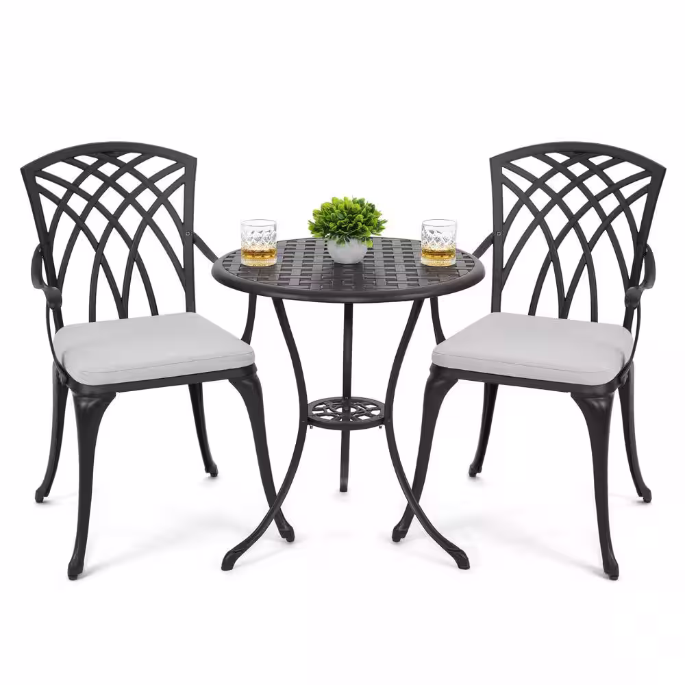 Nuu Garden 3-Piece Cast Aluminum Patio Bistro Set Rust-proof Outdoor Bistro Set with Gray Cushion
