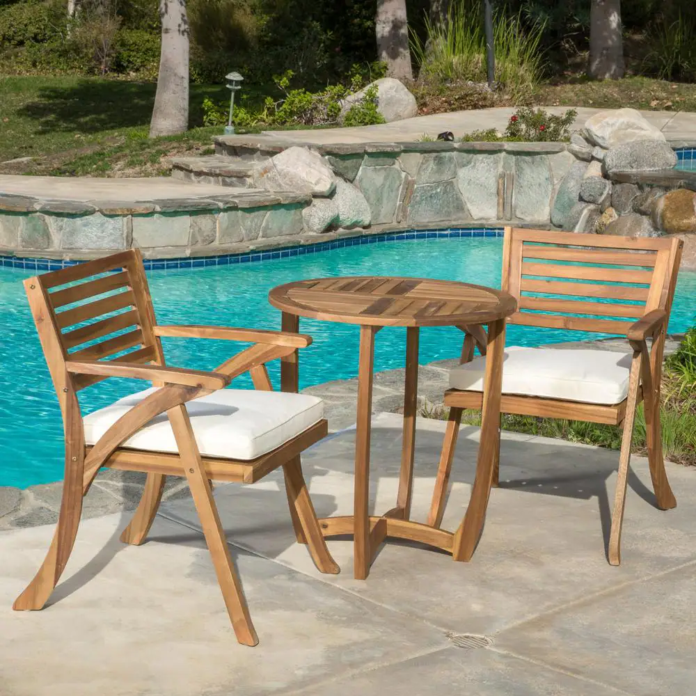 Noble House Coronado Teak Brown Finish 3-Piece Wood Round Outdoor Bistro Set with Cream Cushions