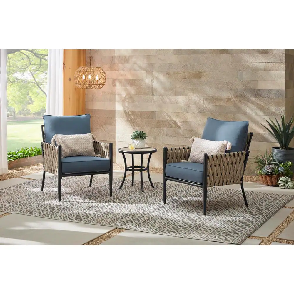 Hampton Bay Dockview 3-Piece Metal Outdoor Patio Bistro Set with Blue Cushions