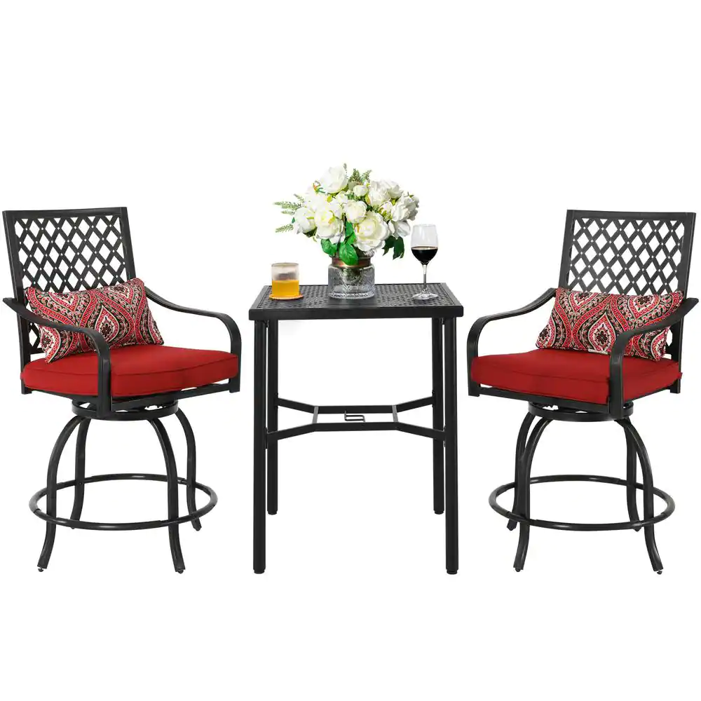 Nuu Garden 3-Piece Patio Swivel Bistro Set Outdoor Balcony Furniture Set with Red Cushions