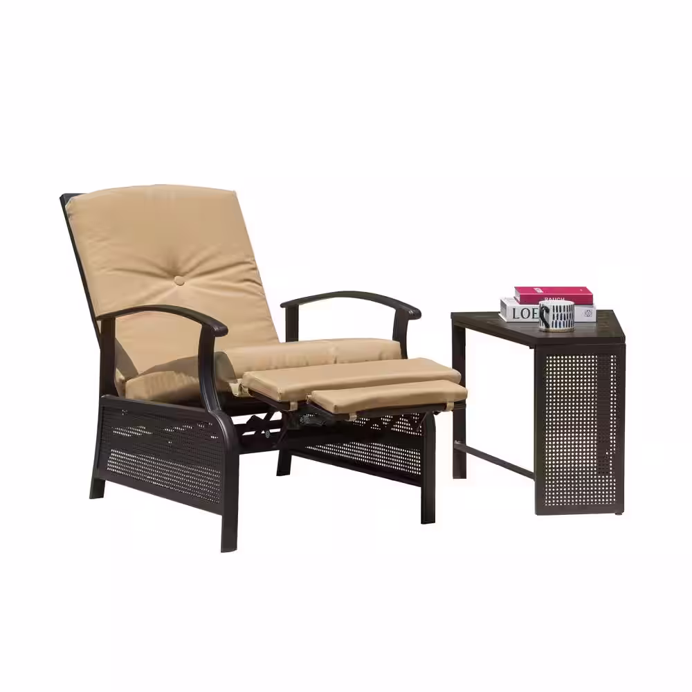 None Brown 2-Piece Metal Outdoor Bistro Recliner Set with Khaki Cushions