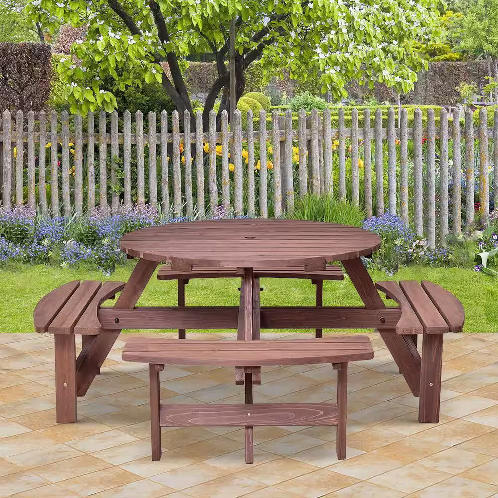 None 2 in. 8-Seat Wooden Outdoor Picnic Table Set with Umbrella Hole
