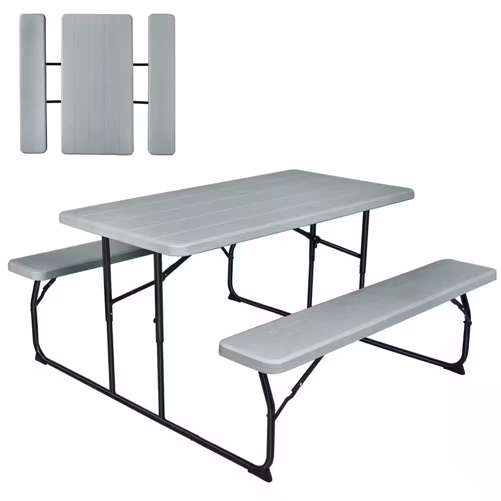 ANGELES HOME 54 in. L Rectangular Metal HDPE Foldable Outdoor Picnic Table Bench Set, Gray