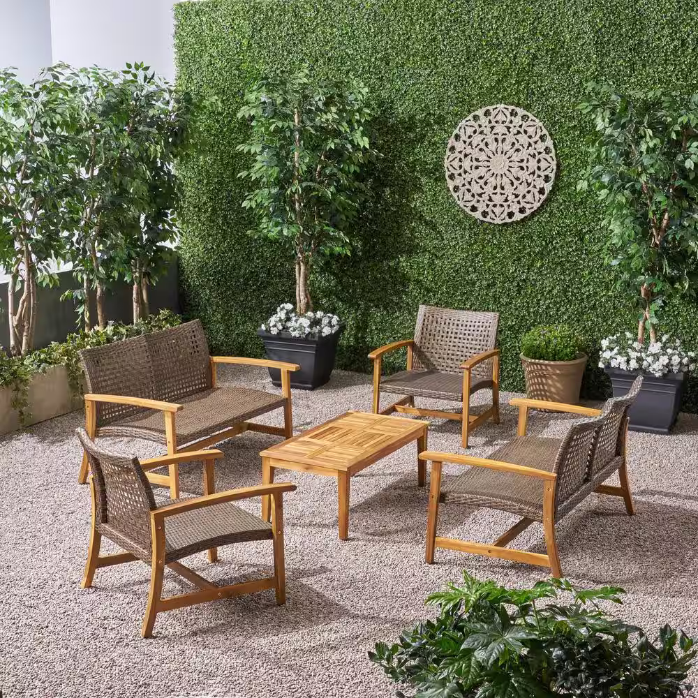 Noble House Hampton Mixed Mocha 5-Piece Wood and Faux Rattan Patio Conversation Set