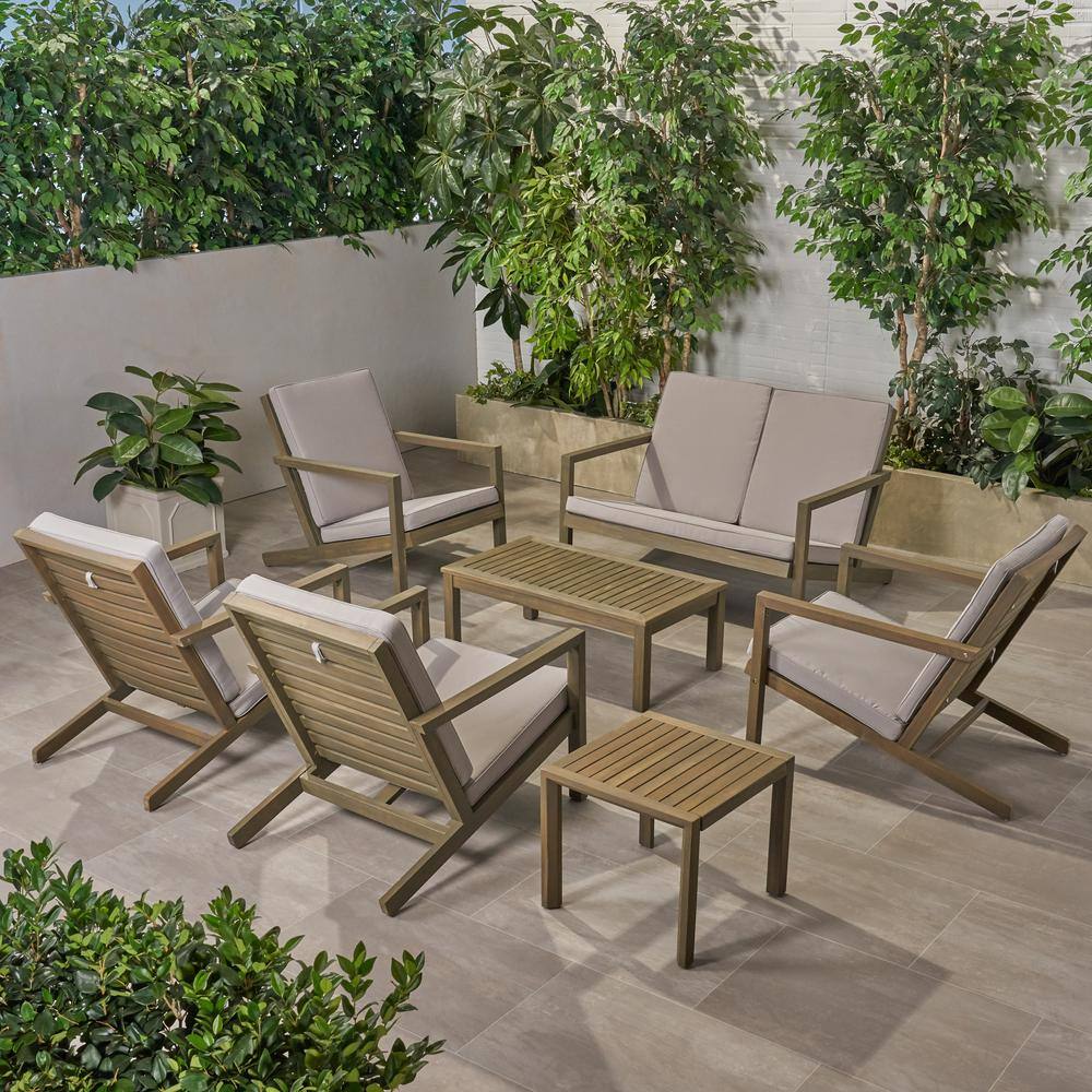 Noble House Leah Grey 7-Piece Wood Patio Conversation Seating Set with Grey Cushions
