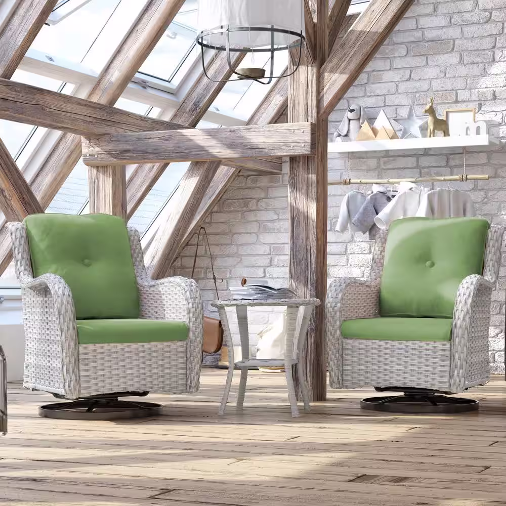None 3-Piece Gray Wicker Patio Conversation Set Swivel Rocking Chair with Green Cushions and Table