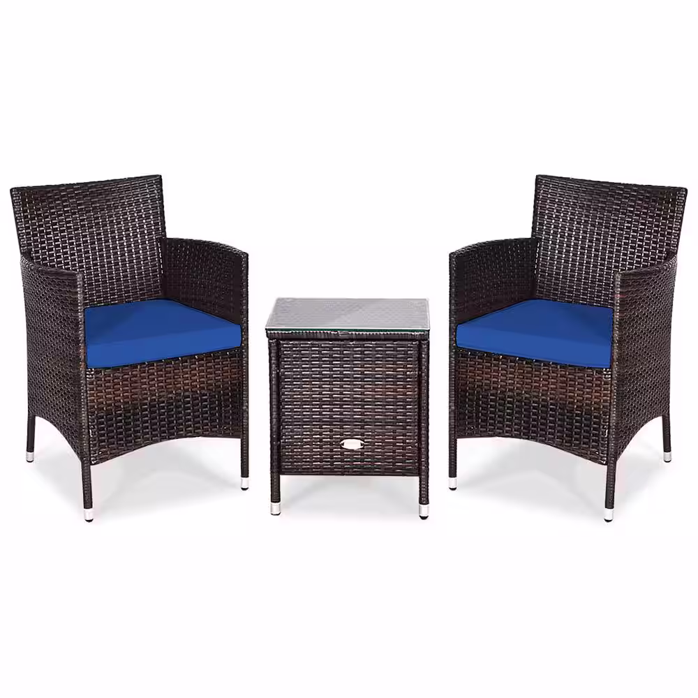 Gymax 3-Piece Rattan Patio Chair and Table Furniture Set Outdoor with Navy Cushion