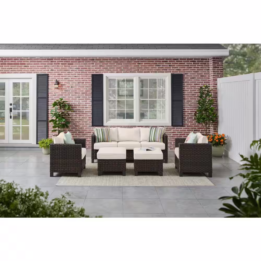StyleWell Sharon Hill 5-Piece Wicker Patio Conversation with Almond Biscotti Cushions