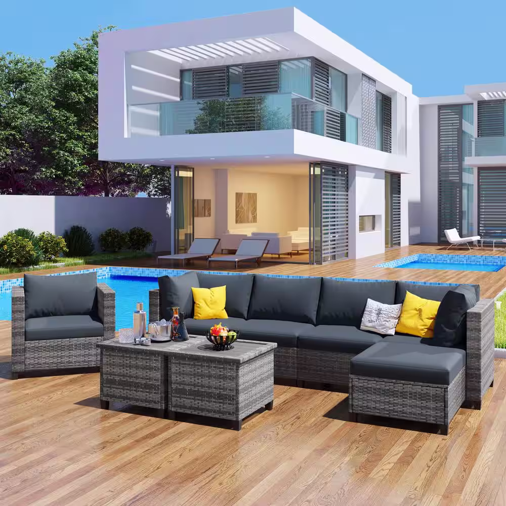 Nestfair 8-Piece Wicker Patio Conversation Set with Gray Cushions and 2 Coffee Tables