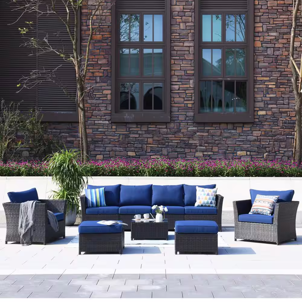 OVIOS Rimaru 9-Piece Wicker Outdoor Patio Conversation Seating Set With Navy Blue Cushions