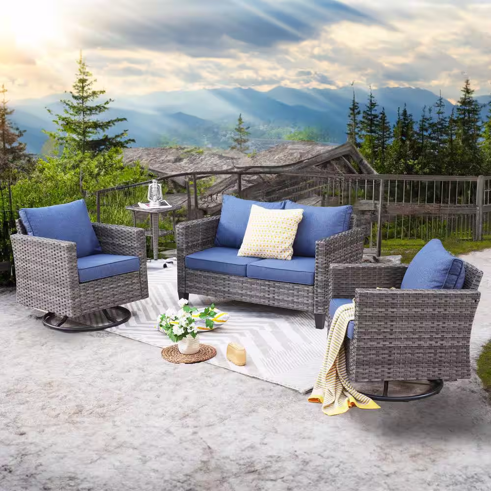 None Mirage Gray 4-Piece Wicker Outdoor Rocking Chair Set with Denim Blue Cushions