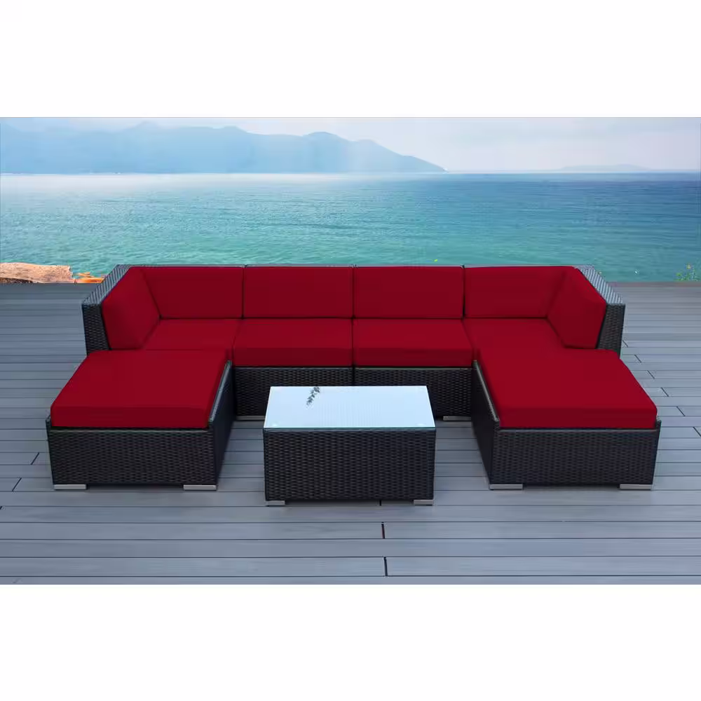 Ohana Depot Ohana Black 7-Piece Wicker Patio Seating Set with Sunbrella Jockey Red Cushions