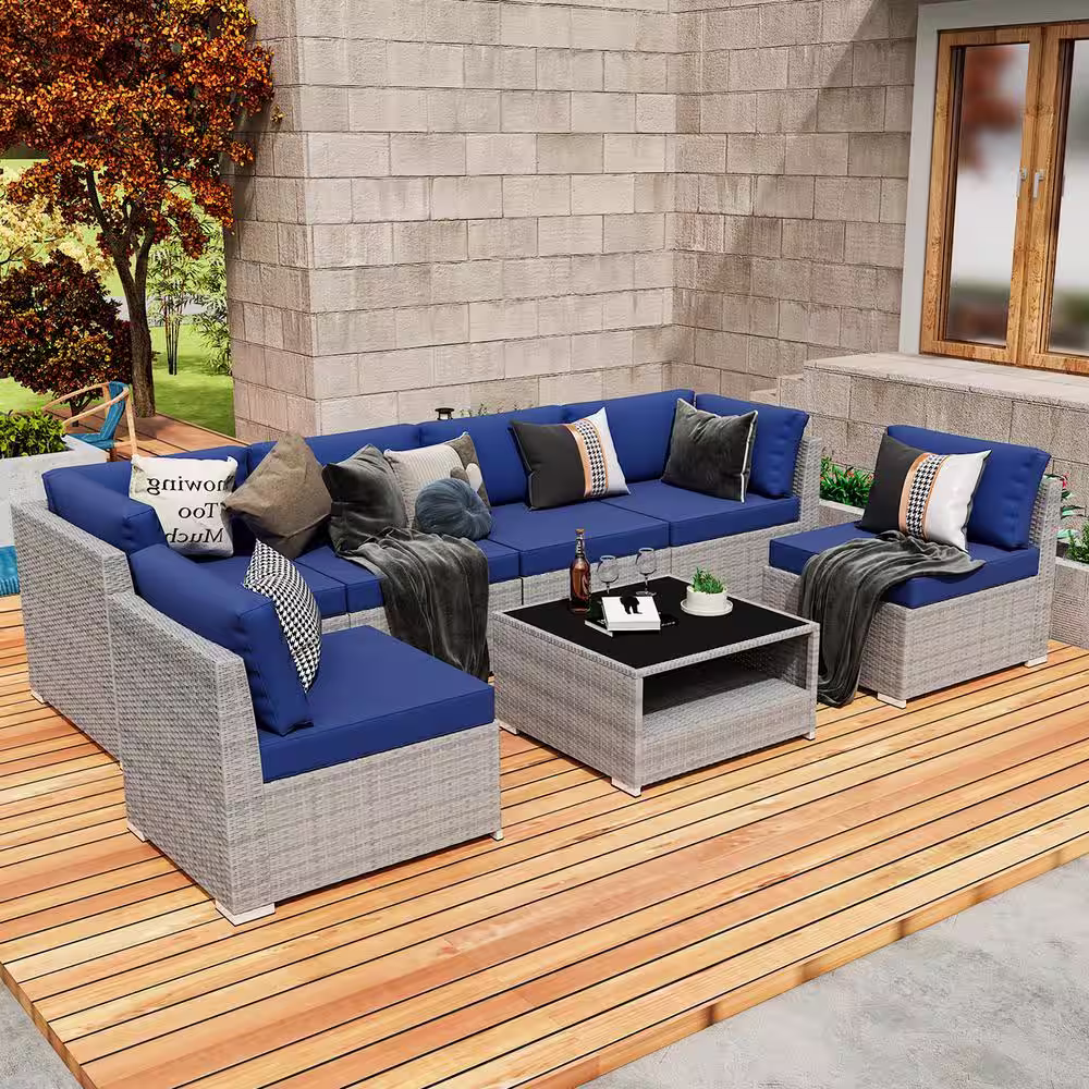 None 7-Piece Wicker Outdoor Patio Conversation Seating Sofa Set with Coffee Table, Dark Blue