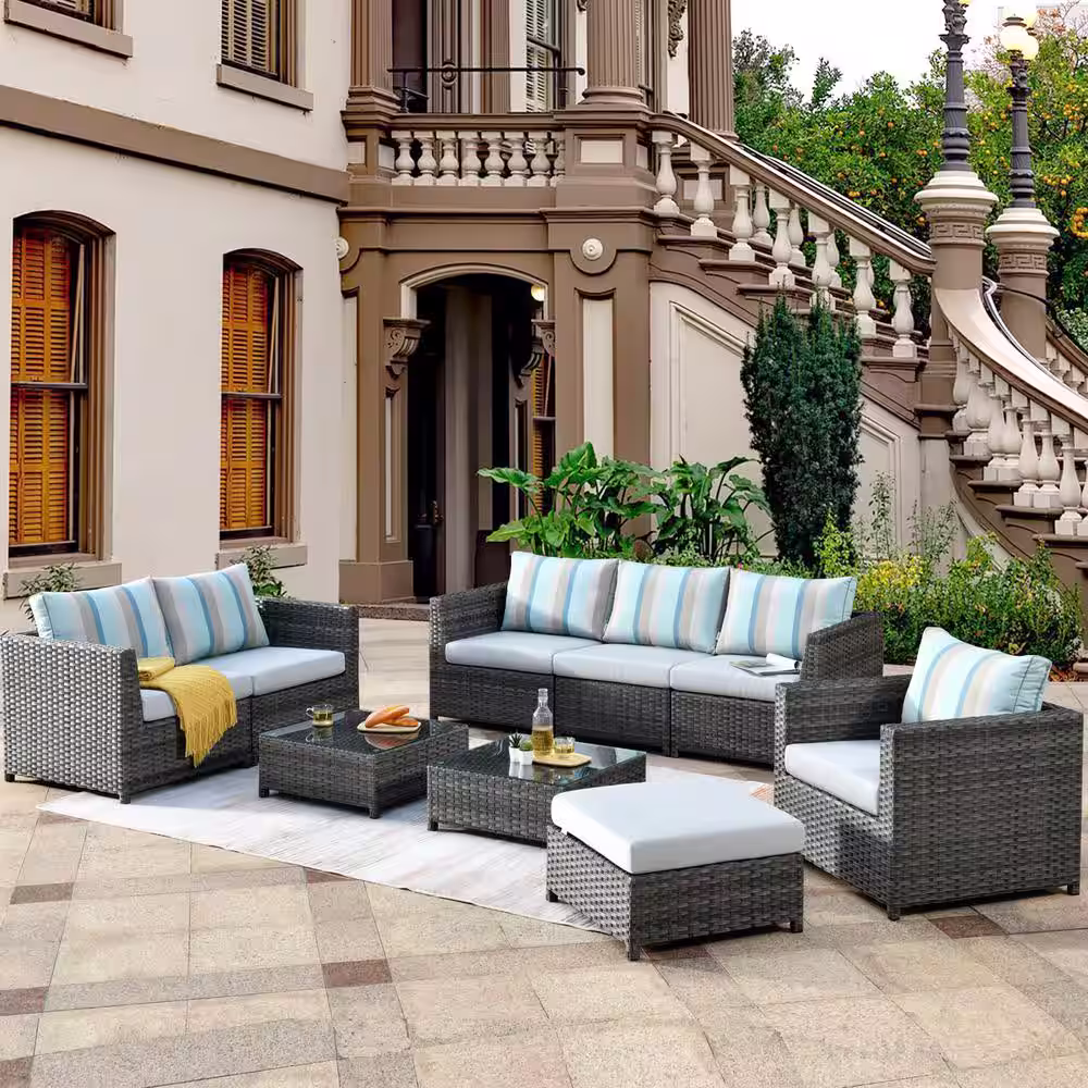 None Tahiti Gray 9-Piece Wicker Outdoor Patio Conversation Seating Set with Gray Stripe Sunbrella Cushions