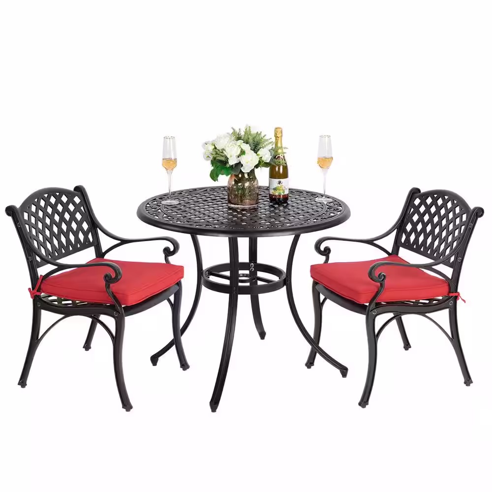 Nuu Garden Antique Bronze 3-Piece Cast Aluminum Patio Conversation Set with Red Cushions