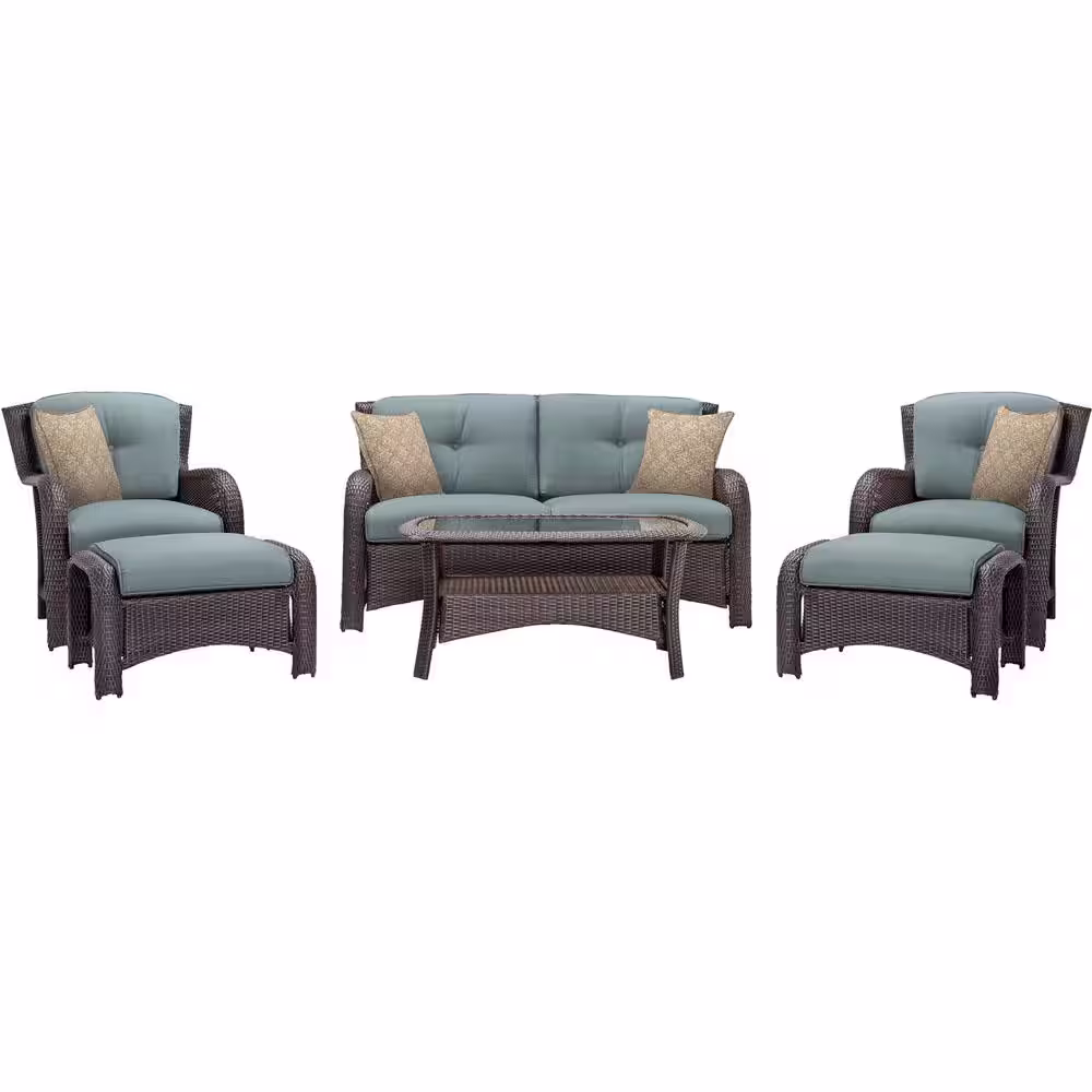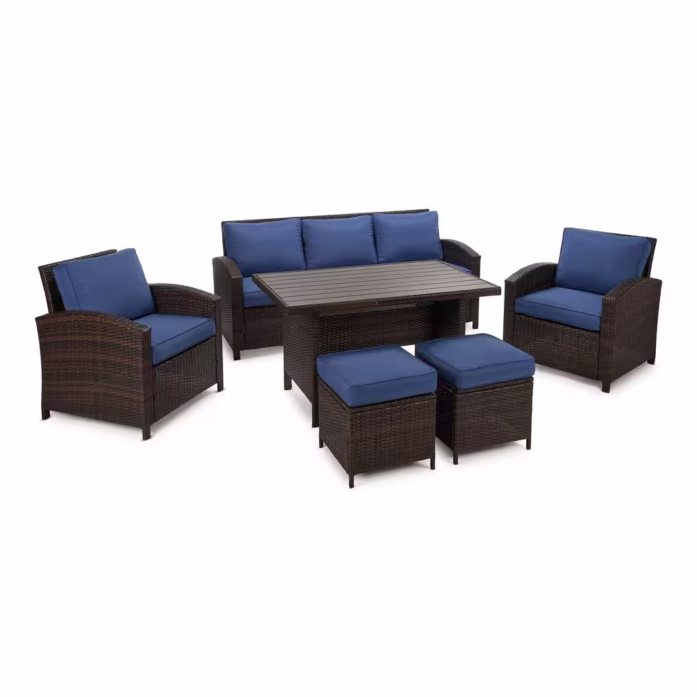 Cambridge Corrolla 6-Piece Wicker Patio Conversation Set with Plush Blue Cushions, Loveseat, Coffee Table, 2 Chairs, 2 Ottomans