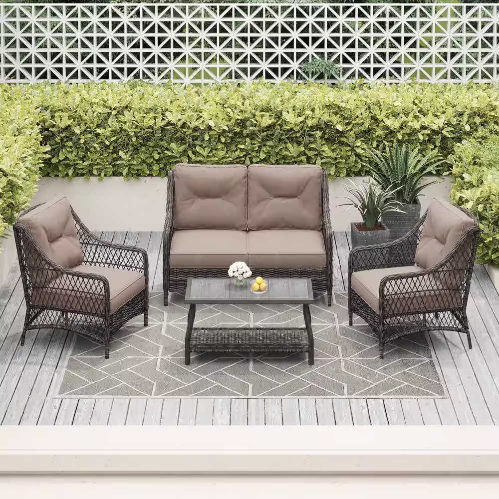 None Vasconia Brown 4-Piece Wicker Outdoor Patio Conversation Set with Brown Cushions