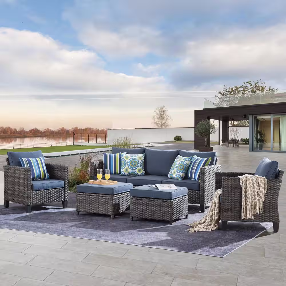XIZZI Jupiter Gray 5-Piece Wicker Outdoor Patio Conversation Seating Sofa Set with Denim Blue Cushions