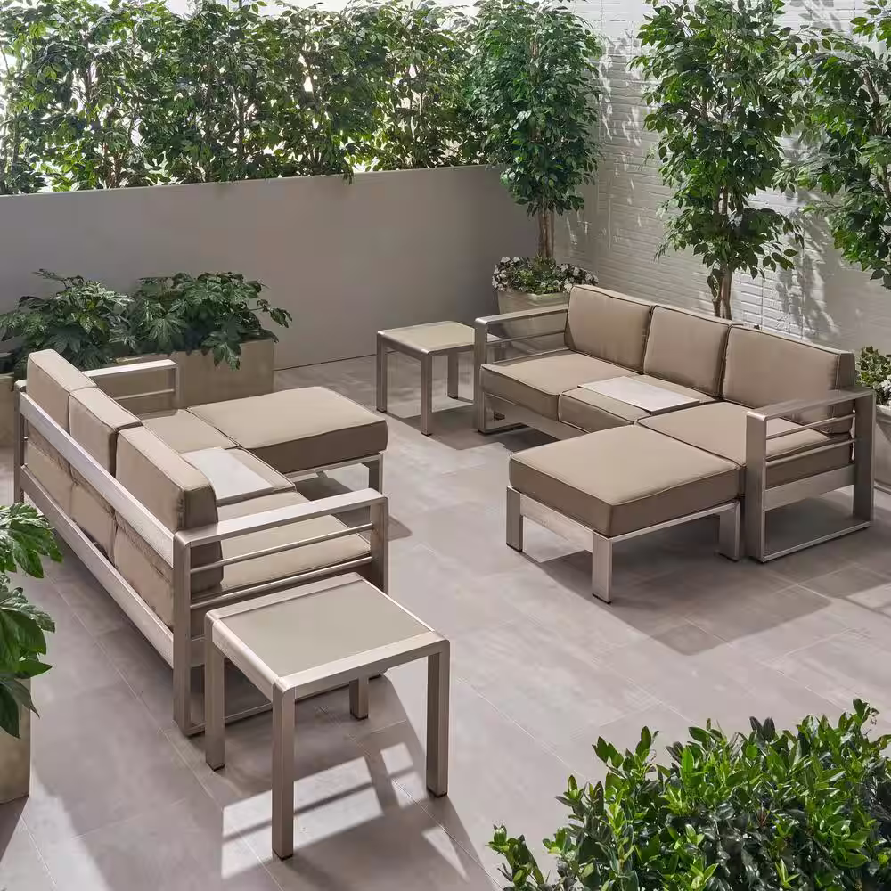 Noble House Cape Coral Silver 6-Piece Aluminum Patio Conversation Sectional Seating Set with Khaki Cushions