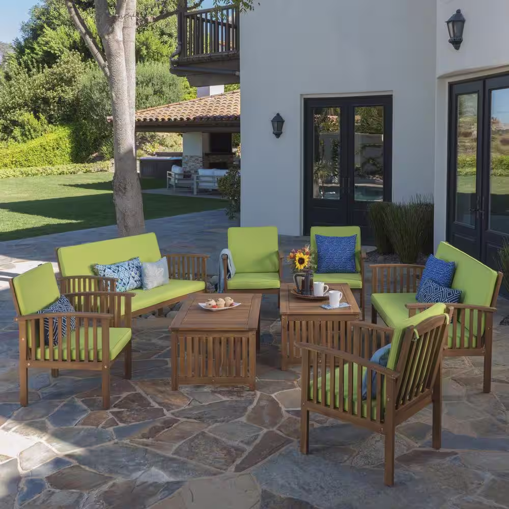 Noble House Thalia Brown 8-Piece Wood Patio Conversation Set with Light Green Cushions