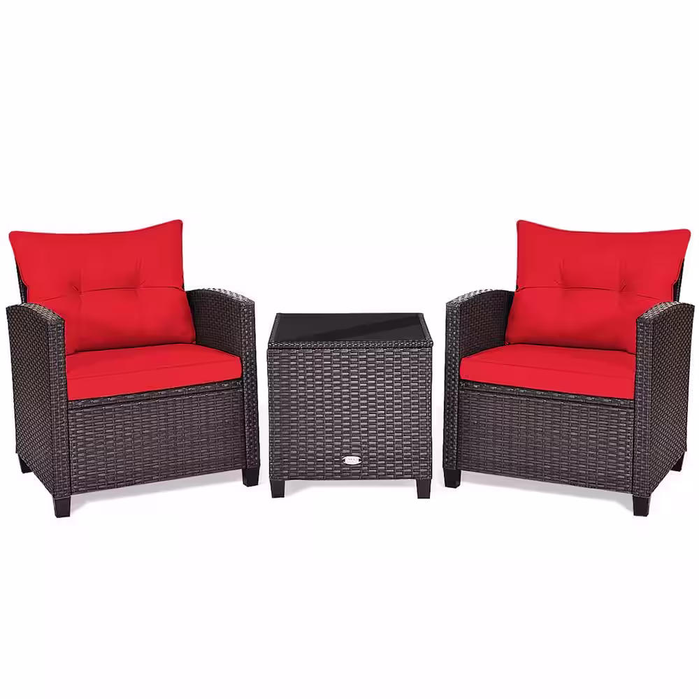 Gymax 3-Pieces Rattan Outdoor Patio Conversation Set with Coffee Table, Red Cushion