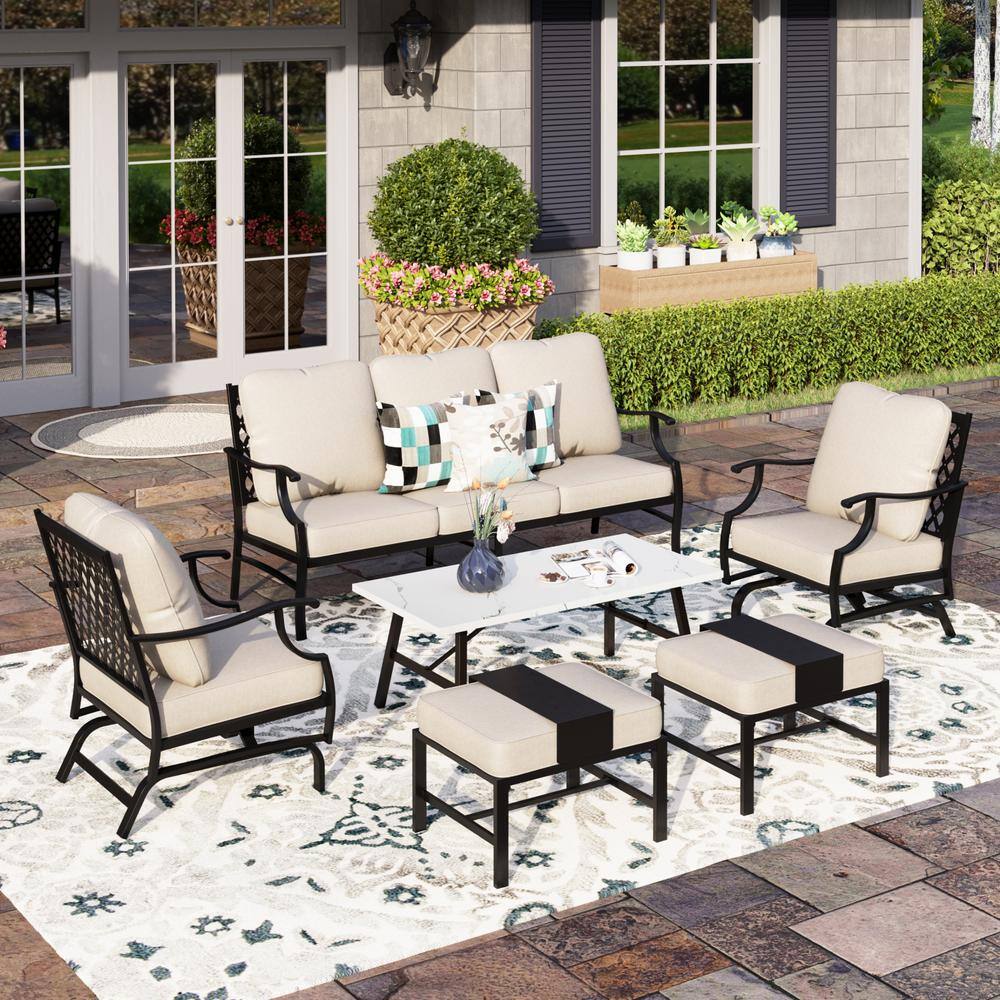 None Black Meshed 7-Seat 6-Piece Metal Outdoor Patio Conversation Set with Beige Cushions and Table with Marble Pattern Top