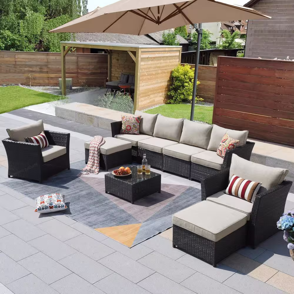 None Minerva Brown 9-Piece Wicker Outdoor Patio Conversation Sectional Sofa Set with Beige Cushions