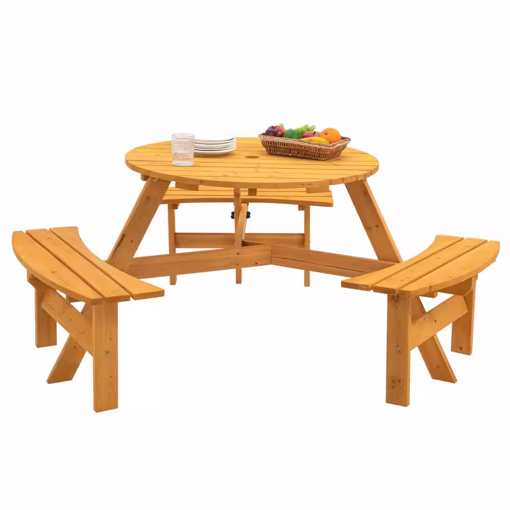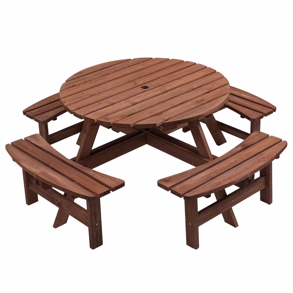 None Brown 35.43 in. 6-Person DIY Circular Fir Wood Outdoor Picnic Table with Benches and Umbrella Hole, High Capacity
