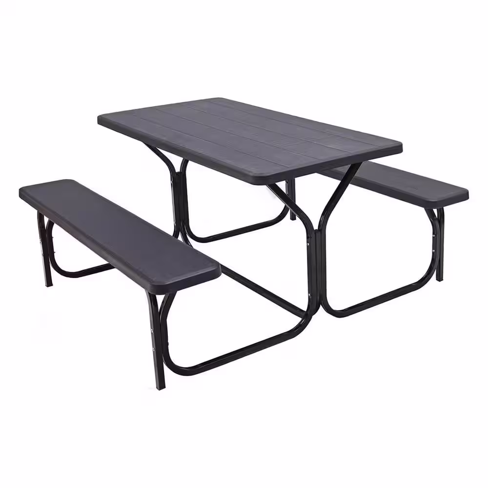 Gardenised 6 ft. Black Outdoor Foldable Woodgrain Picnic Table Set with Metal Frame