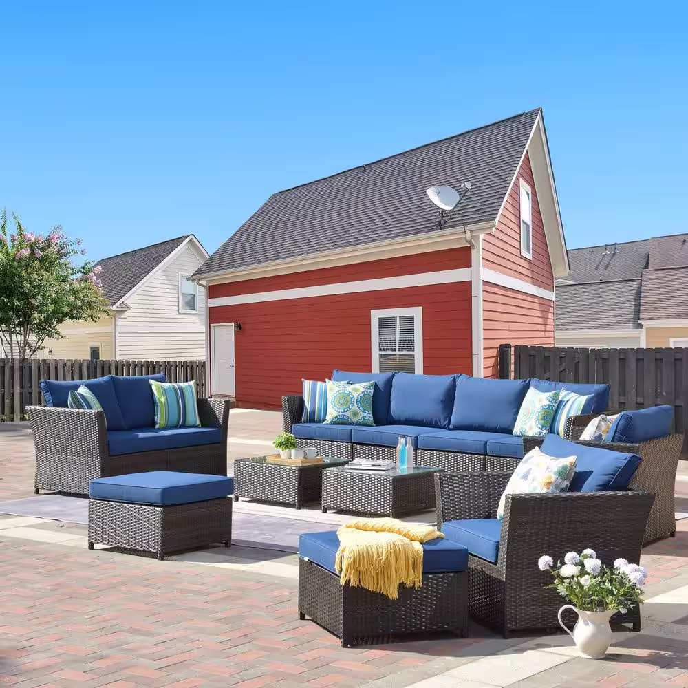 HOOOWOOO Norman Brown 12-Piece Wicker Outdoor Patio Conversation Seating Sofa Set with Navy Blue Cushions, No Assembly Required