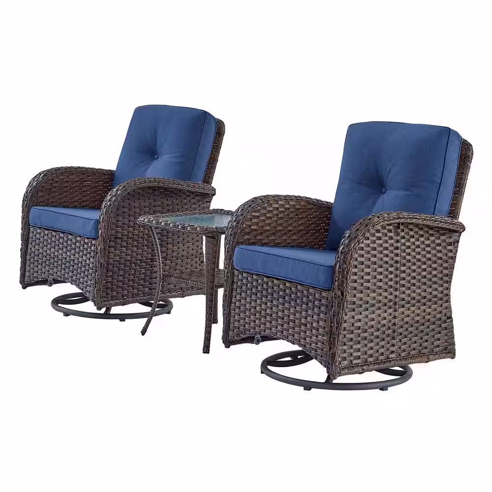 Pocassy Brown 3-Piece Wicker Patio Conversation Set with Blue Cushions and Coffee Table All-Weather Swivel Rocking Chairs
