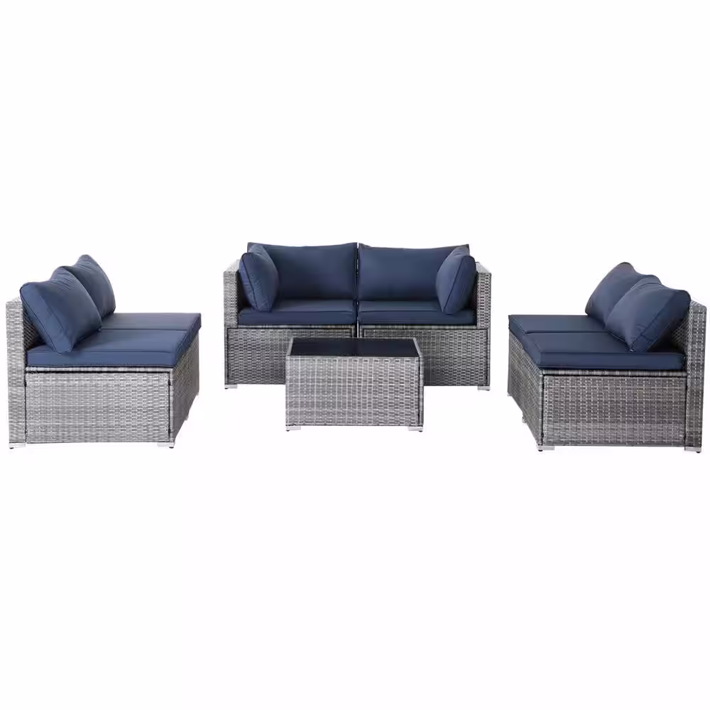 None All-Weather 7-Piece Gray PE Wicker Patio Conversation Set with Navy Blue Cushions