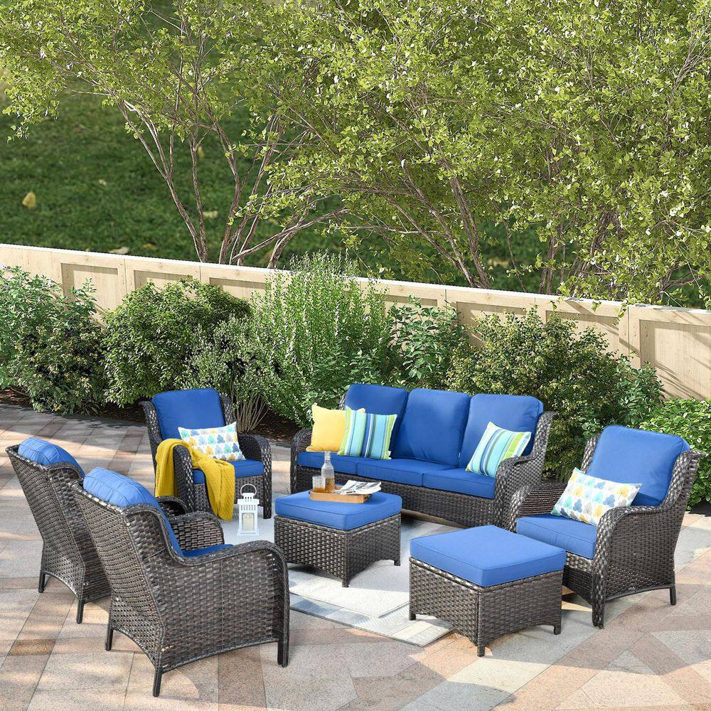 XIZZI Santorini Brown 7-Piece Wicker Outdoor Patio Conversation Seating Sofa Set with Navy Blue Cushions