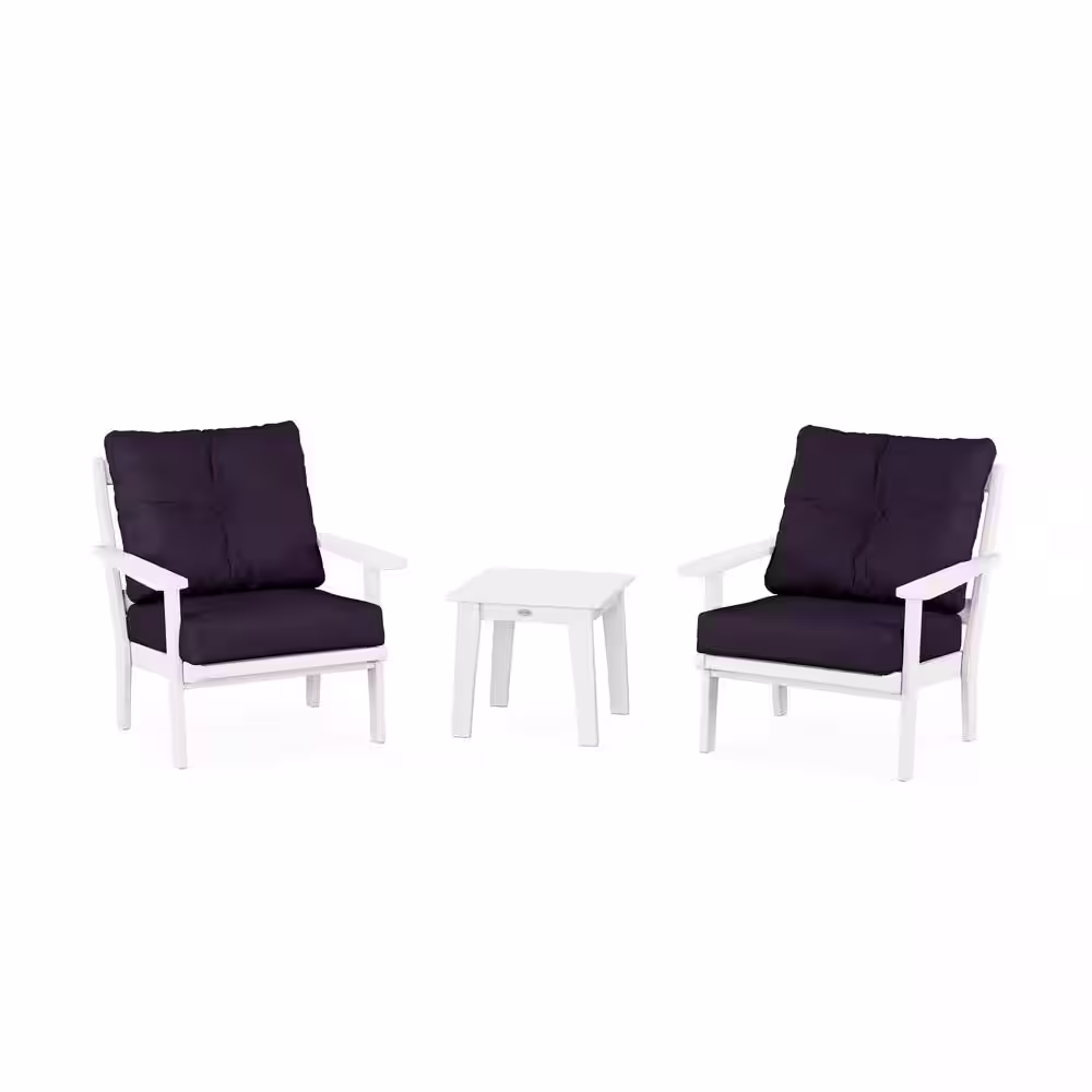 POLYWOOD Mission 3-Pcs Plastic Patio Conversation Set in White/Navy Linen Cushions