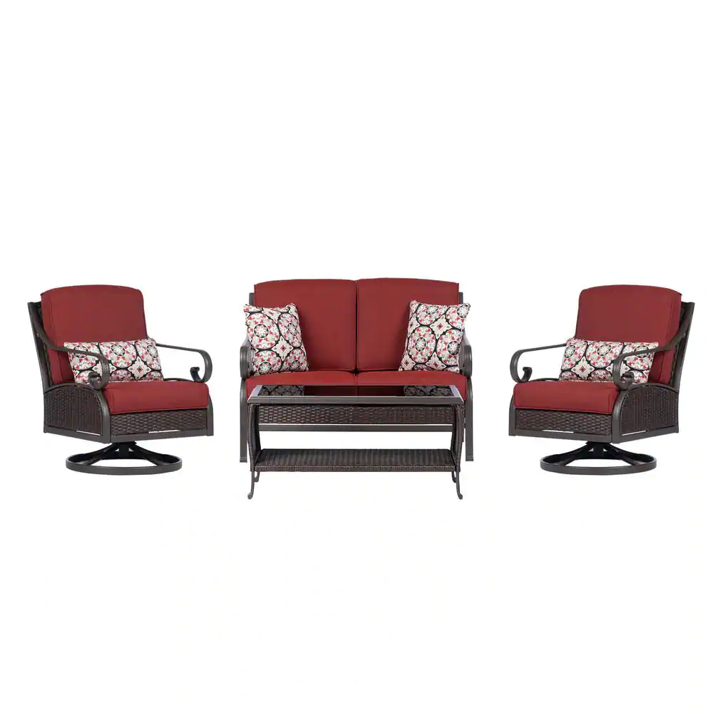 Hanover Madrid 4-Piece Wicker Patio Conversation Set w/ Red Cushions, 2 Swivel Chairs, Loveseat, Coffee Table, All-Weather