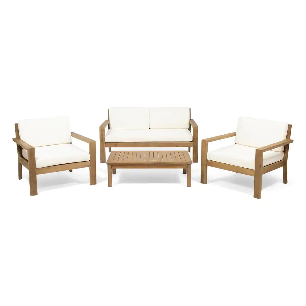 Noble House Santa Ana Brushed Light Brown 4-Piece Wood Patio Conversation Set with Cream Cushions