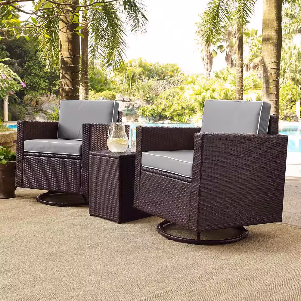 None Palm Harbor 3-Piece Wicker Patio Outdoor Conversation Set with Grey Cushions - 2 Swivel Chairs and Side Table