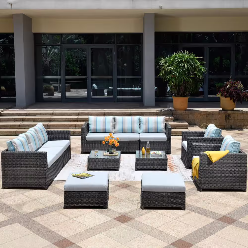 HOOOWOOO Lake Caddo Gray 12-Piece No Assembly Wicker Outdoor Patio Conversation Seating Set with Gray Striped Sunbrella Cushions