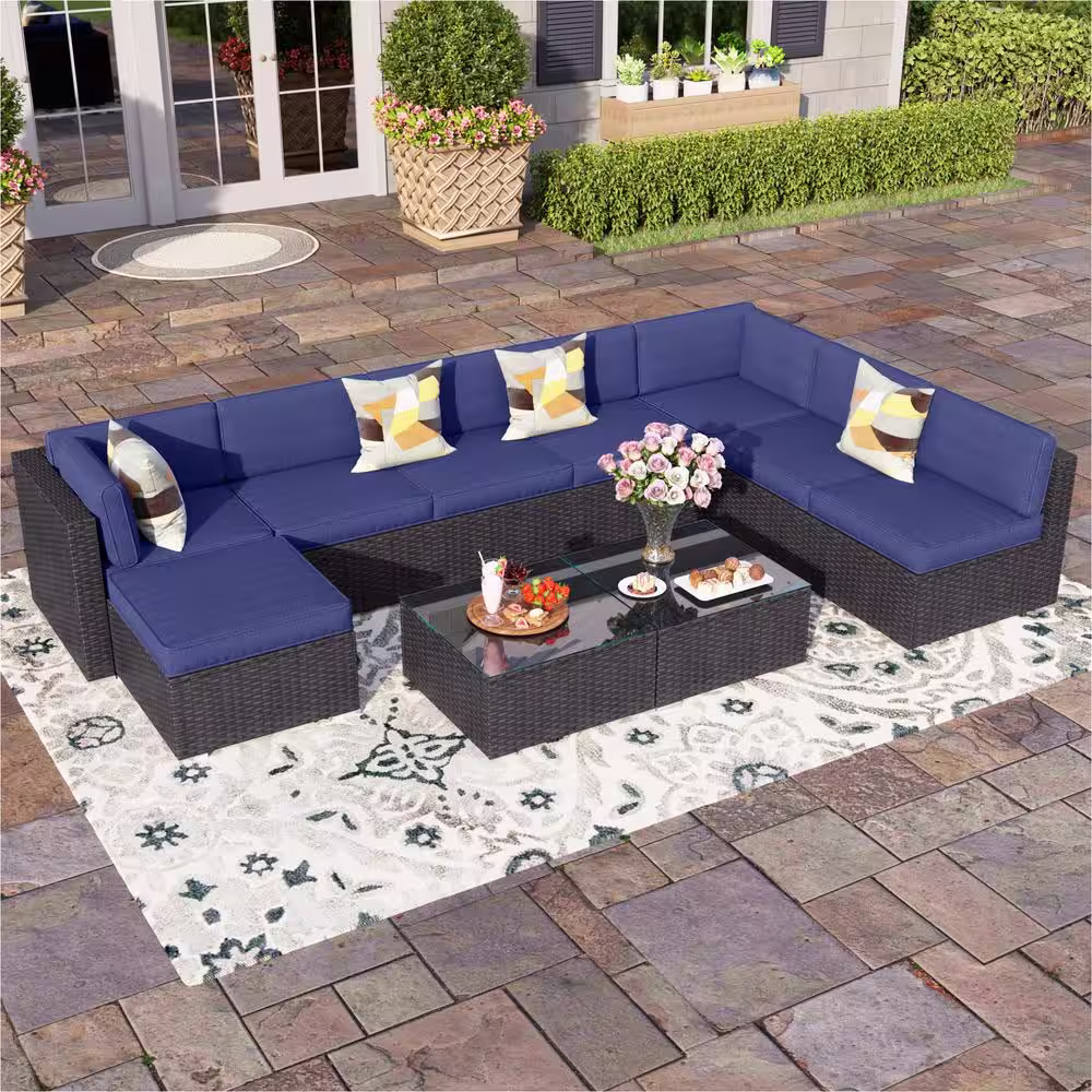 None Dark Brown Rattan Wicker 8 Seat 10-Piece Steel Outdoor Patio Conversation Set with Blue Cushion,Coffee Table and Ottoman