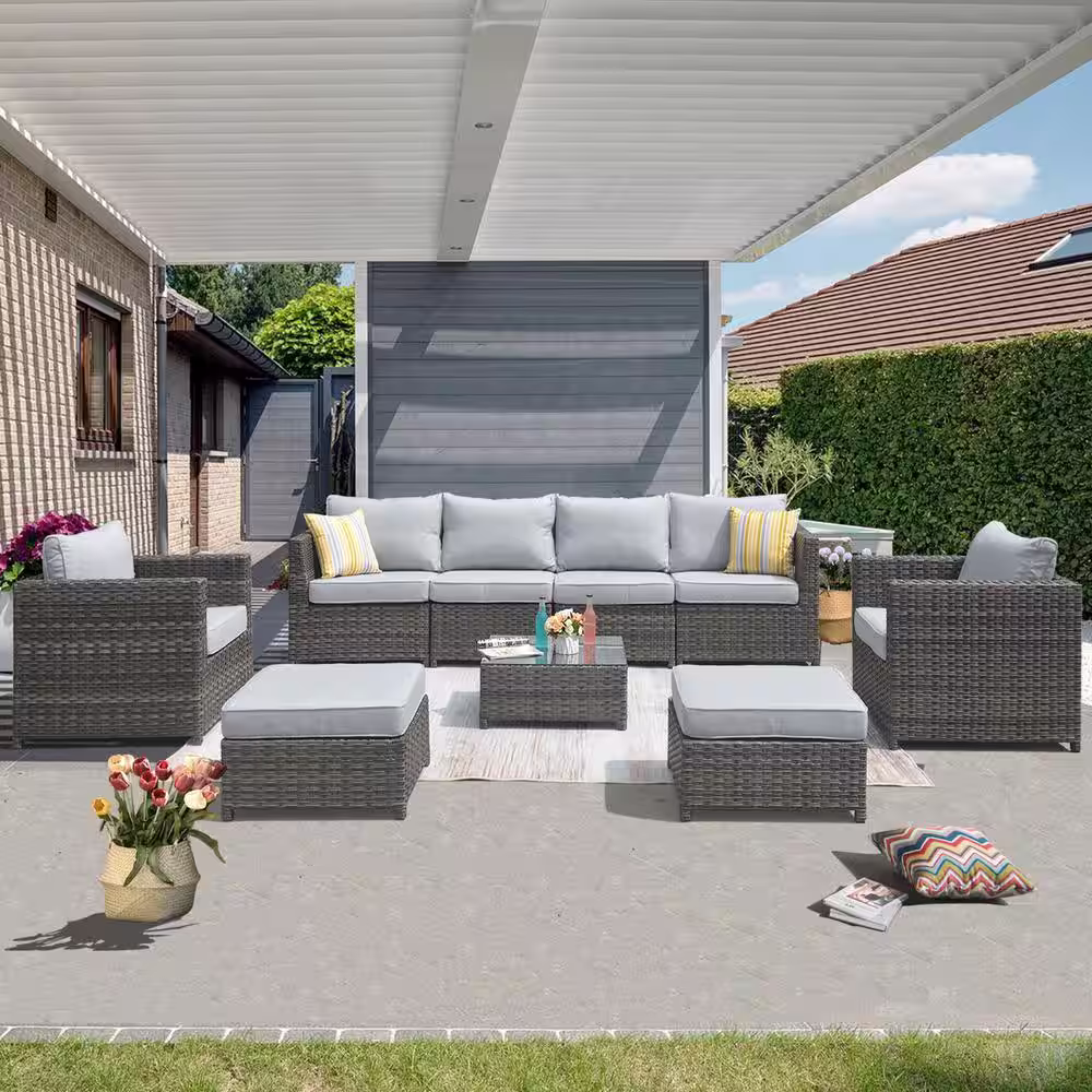 XIZZI Ontario Lake Gray 9-Piece Wicker Outdoor Patio Conversation Seating Set with Grey Cushions