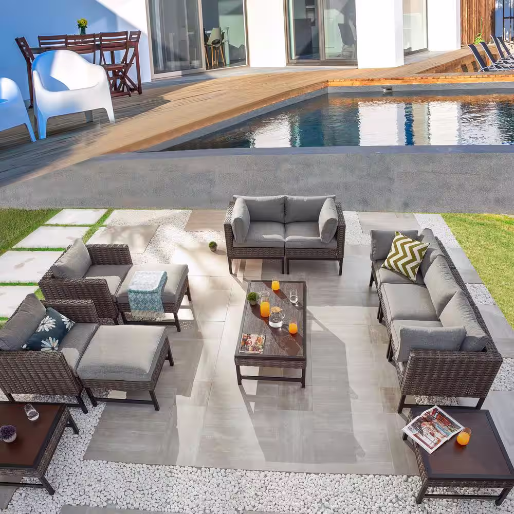 Patio Festival 12-Piece Wicker Right-Angle Collection Patio Conversation Set with Gray Cushions