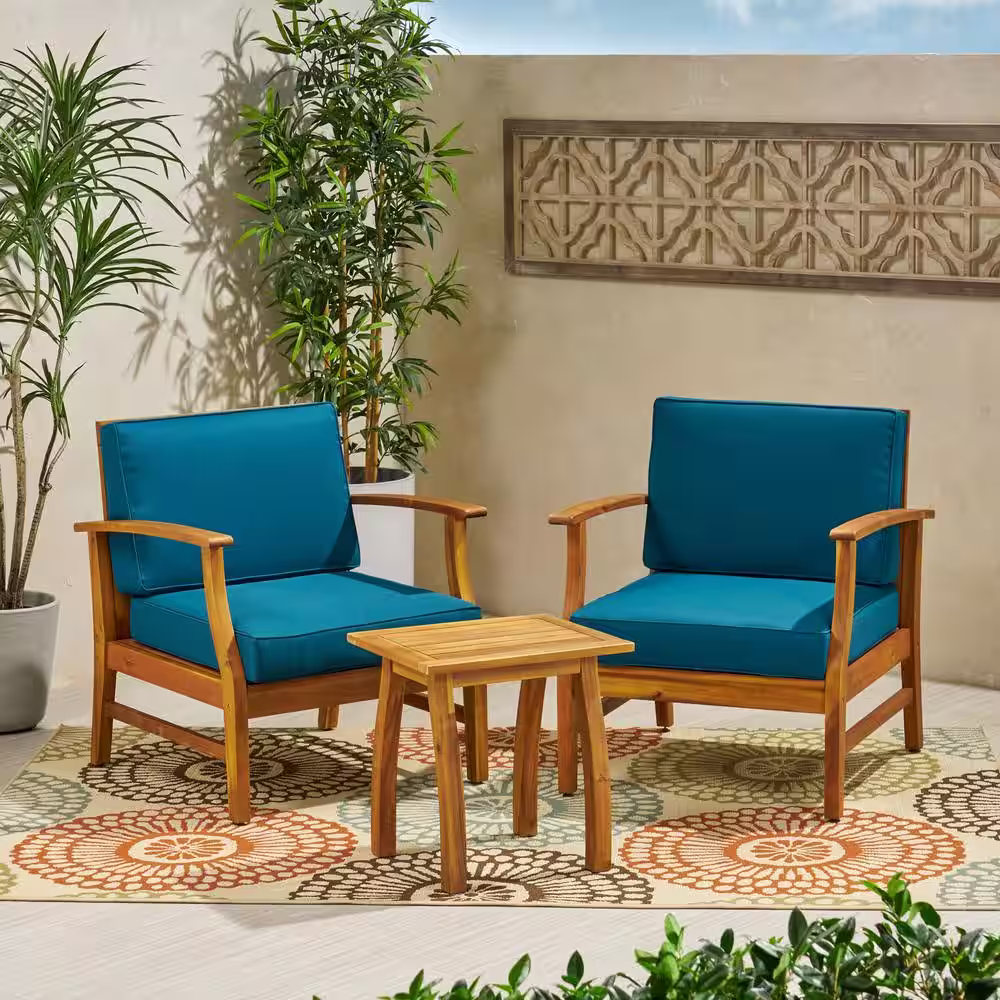 Noble House Perla Teak Brown 3-Piece Wood Patio Conversation Seating Set with Blue Cushions